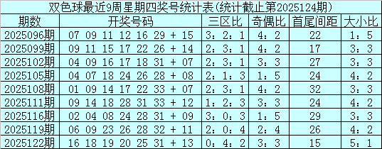 奇偶比分析:最近9周星期四奇偶红球出现个数比为25:29,偶数红球走热,本期注意奇偶红球平衡出现,奇偶比看好3:3。