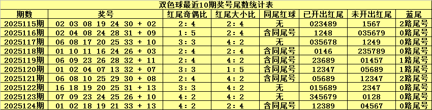 最近10期双色球红球尾数0-9开出频次分别为:尾数6 8出现8个,尾数1出现7个,尾数0 2 3 4 9出现6个,尾数5出现4个,尾数7出现3个,尾数0-9全部出现。本期注意尾数:14569,注意尾数1开出同尾红球。