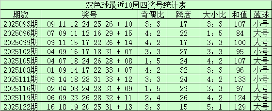 大小走势分析:上期开出大小比为4:2,上周四红球大小比5:1,最近十周四大号红球表现占优,本期看好大号红球继续走热,推荐大小比4:2。