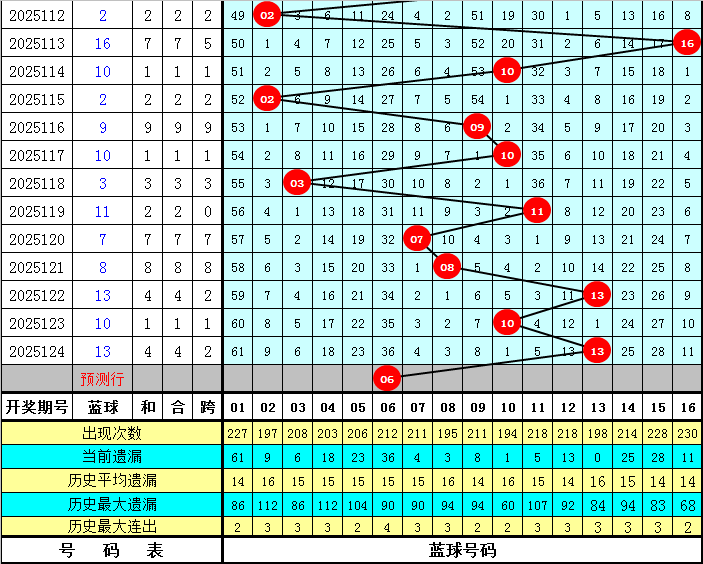 蓝球分析(定义:01-04为一区,05-08为二区,09-12为三区,13-16为四区):上期蓝球开出四区号码13,最近10期蓝球四区落号比为2:2:4:2,总体上各区蓝球走势基本平衡,本期蓝球看好在第二区开出,独蓝参考06。