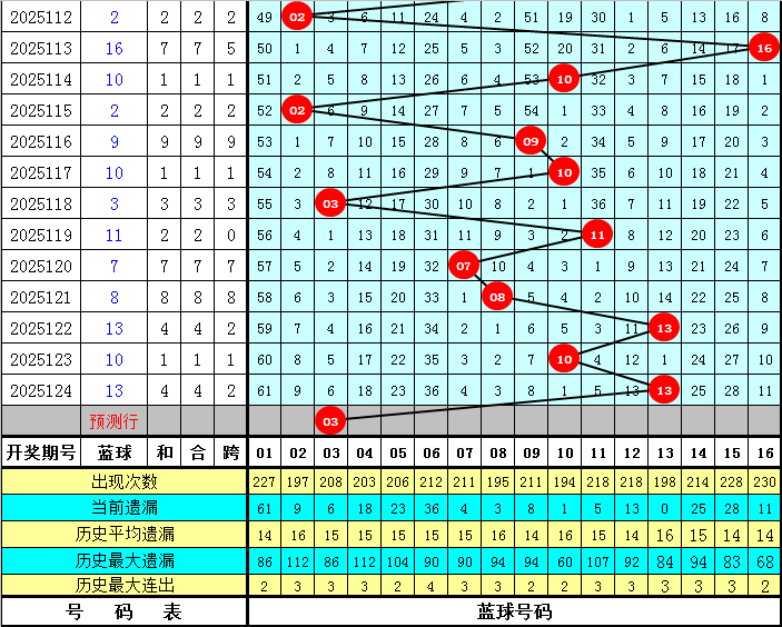 蓝球分析:在第125期历史同期开奖中,蓝球号码奇偶比为11:9,最近5年同期奇偶走势为:奇、奇、偶、偶、奇,今年同期预计再出奇数号码,参考蓝球03。