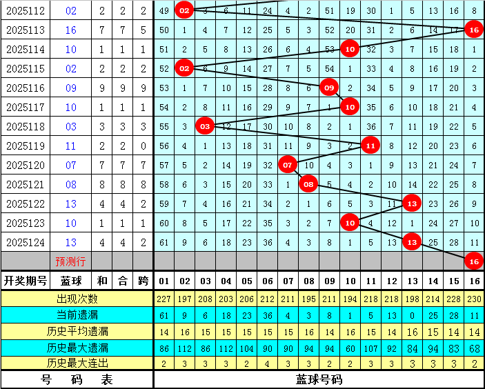 1路红球号码:上期开出了2个,走温。最近5期开出14个1路红球号码:01 04 07 10 13 16 19 25 31,其中1路红球号码大小个数相等,奇数1路红球号码表现活跃。本期参考1路红球号码:01 13 16 25 28 31。