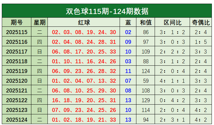 上期和值为:94,近10期和值分别为:86、97、109、88、124、59、108、129、114、94,预计本期和值走势范围上升,本期推测红球和值出现范围在115-120区间。