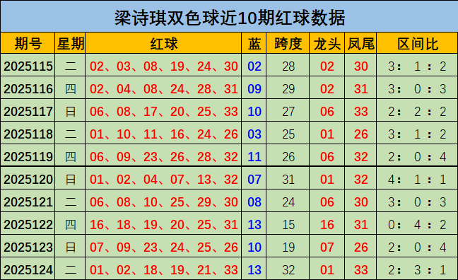 区间比分析:红一区(1-11)红二区(12-22)红三区(23-33),上期开出区间比2:3:1,近10期区间比为24:12:24,1区出号较热,2区出号较冷,3区出号较热,综合分析,本期预测2区出号较热,开出区间比1:3:2。
