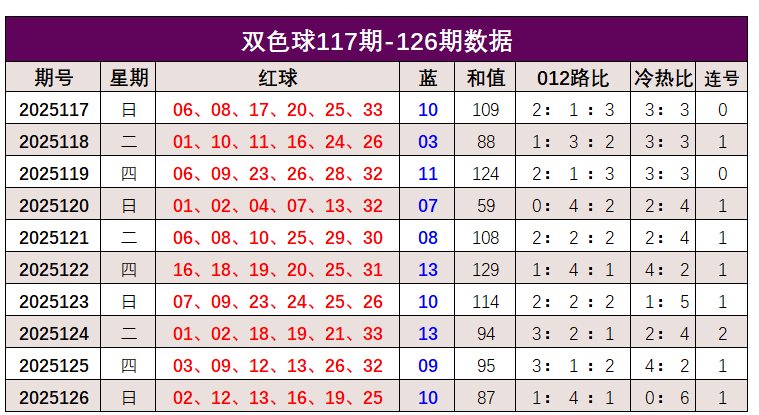 双色球第2025126开奖奖号:红球02、12、13、16、19、25,蓝球10。红球和值87,012路比1:4:1,冷热比0:6,开出1组连号。