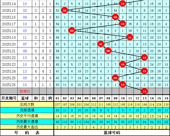 4、最大间距:最大间距近十期主要在06-19之间波动,上期最大间距为10,本期继续关注10附近的最大间距,看好最大间距为9。