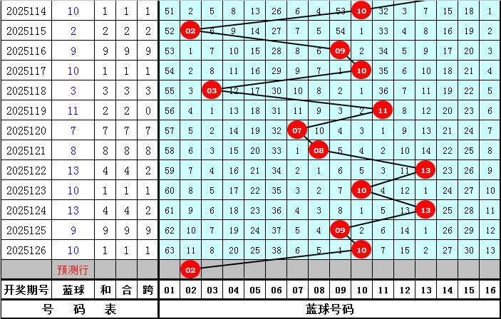 蓝球号码:最近9期分别开出蓝球号码03、11、07、08、13、10、13、09、10,蓝球号码012路个数比为2:5:2,其中0路蓝球开出最少,本期可以放弃,参考蓝球02、05、08、11。