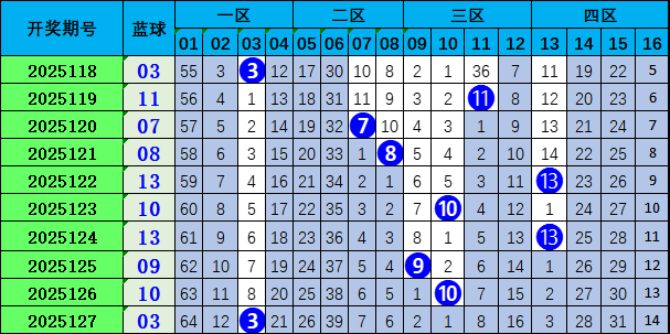 上期蓝球开出奇数号码03。近期奇偶球比值7:3,奇数球走势活跃,本期看好偶数球热出,推荐号码04。