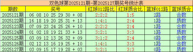 开奖回顾:福彩双色球第2025127期红球为:03 09 15 17 19 28,蓝球为:03,红球012路比为3:2:1,和值为91,跨度为25,质合比为3:3,蓝球为0路、质数号码。
