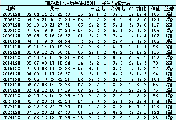 在第128期历史同期奖号中,红球三区分布总比例为40:43:37,奇偶总比例为71:49,012路比为37:38:45,和值分布在73-134之间,蓝球号码012路总比例为4:7:9。