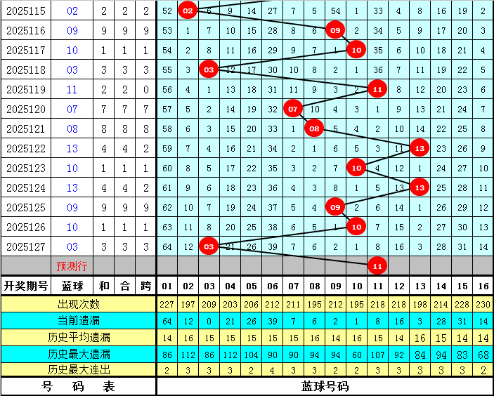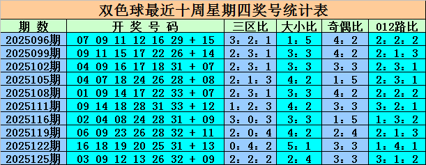 蓝球走势分析:上周四第25125期蓝球开出号码09,最近十周星期四蓝球号码大小比为7:3,奇偶比为7:3,012路比为4:3:3。本期蓝球建议侧重奇数号码,参考蓝球07、11。