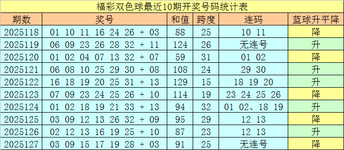 上期开奖:福彩双色球第2025127奖号开出:03 09 15 17 19 28 + 03,红球号码和值为91,首尾间距为25,无连号。
