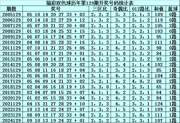 在第129期历史同期奖号中,红球三区分布总比例为48:36:36,奇偶总比例为62:58,012路比为45:35:40,和值分布在64-124之间,蓝球号码012路总比例为4:11:5。