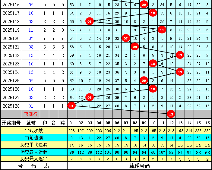 蓝球分析:上期蓝球开出号码01,下降2个点位,最近10期蓝球号码升平降分别为:升、降、升、升、降、升、降、升、降、降,本期防蓝球号码上升,一码蓝球关注12。