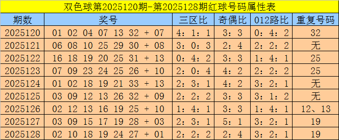 红球012路比:上期红球012路比开出3:2:1,最近9期红球012路个数比为18:23:13,本期看好012路红球走势相当,关注红球012路比2:2:2。