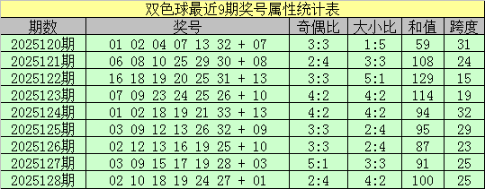 双色球上期第2025128期奖号为02 10 18 19 24 27 + 01,红球号码奇偶比为2:4,大小比为4:2,和值为100,跨度:25。