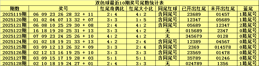 双色球第2025128期奖号为:02 10 18 19 24 27 + 01,红球尾数为:024789,没有出现同尾红球。