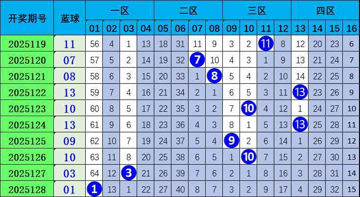 一区(01-11):上期该区开出奖号2枚,近10期共开出20个奖号,本区出号趋势较温,本期推荐该区出号2枚:04 07。