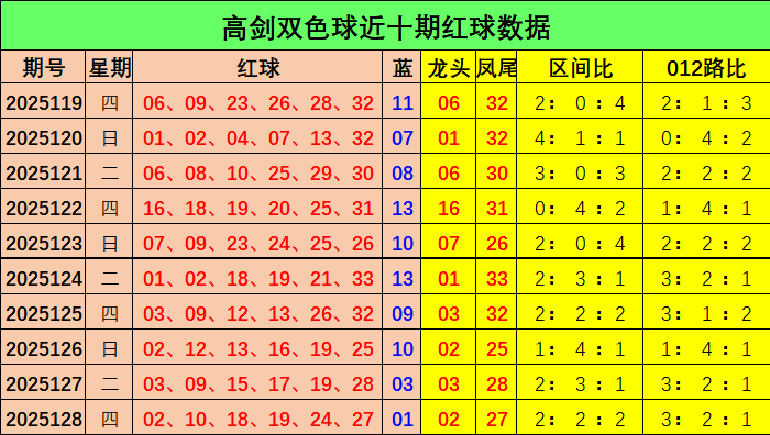 上期012路比3:2:1,近10期012路比为20:24:16,1路号码出号较热,本期预测1路球出号较冷,推荐012路比为3:1:2。
