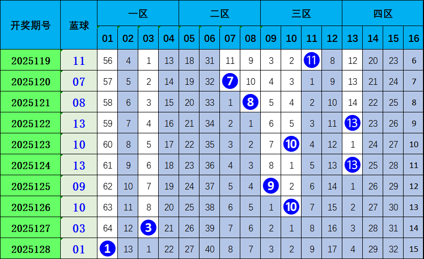 上期蓝球开出号码01,近10期蓝球号码大小比为6:4;近10期奇偶比7:3,奇数号码出号较热,根据蓝球走势综合分析,本期一码独蓝推荐15。