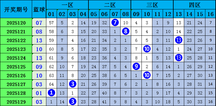 双色球上期开奖号码回顾:红球03 04 07 13 20 30;蓝球03,红球号码大小比为2:4,三区比为3:2:1。蓝球开出小奇数03。