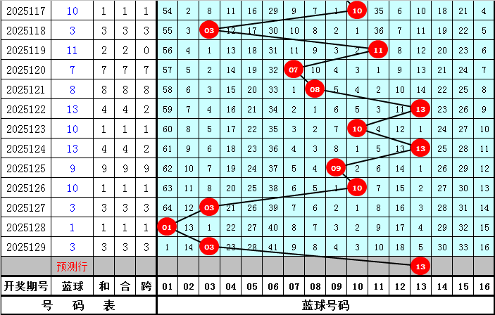 蓝球前10期开出号码为:07→08→13→10→13→09→10→03→01→03。