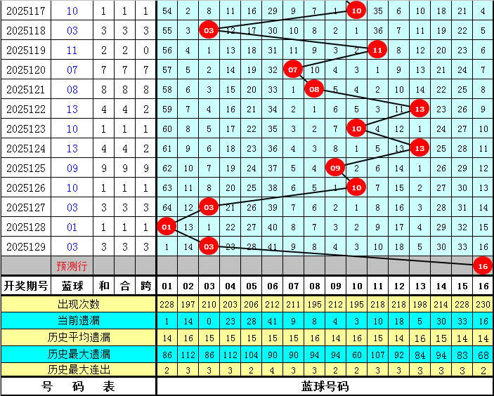 蓝球分析:最近9周星期二蓝球分别开出号码:16、13、08、16、02、03、08、13、03,本周星期二看好出现大号蓝球,参考蓝球号码16。