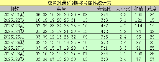双色球上期第2025129期奖号为03 04 07 13 20 30 + 03,红球号码奇偶比为3:3,大小比为2:4,和值为77,跨度:27。