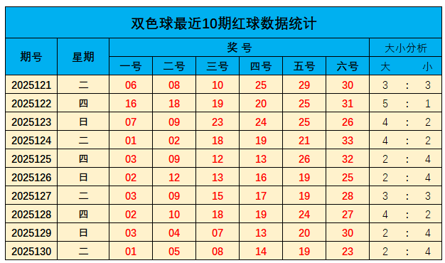 上期红球大小比为2:4,近10期大小比为31:29;总体上大奖号走势稍热,本期关注大数较上期走势升温,推荐大小比为:4:2