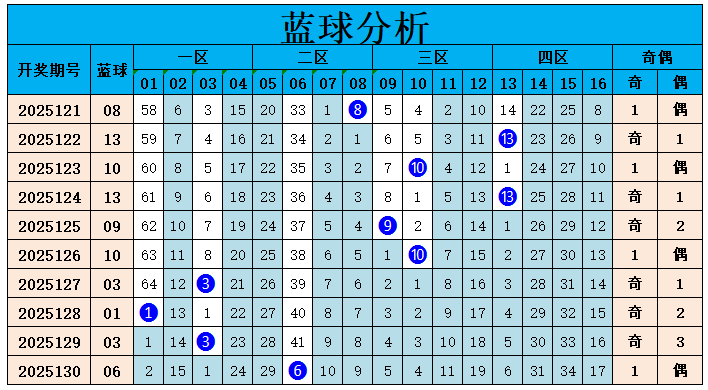 蓝球分析:上期蓝球开出偶数号码06,近10期奇偶比为6:4,奇数走势稍热,近十期蓝球奇偶走势为:偶-奇-偶-奇-奇-偶-奇-奇-奇-偶-,本期蓝球关注偶数开出;本期蓝球参考:10