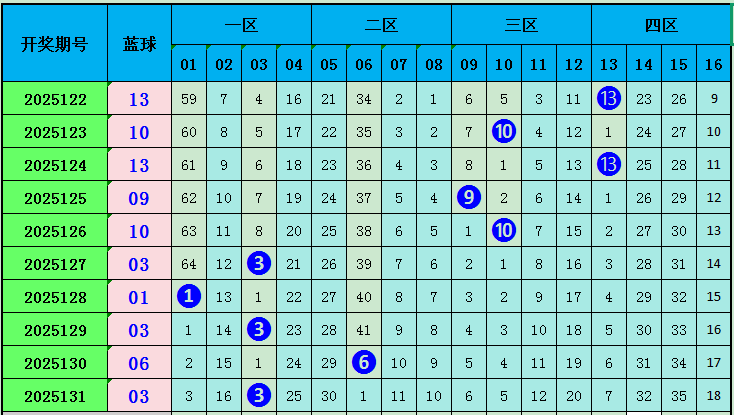 蓝球:前10期蓝球分别为:13 10 13 09 10 03 01 03 06 03,其中奇偶蓝球奇数球胜出,本期看好奇数蓝球,参考蓝球07.