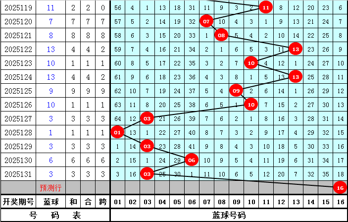 蓝球大小:近50期蓝球大小比为27:23,大号蓝球占优,近10期蓝球大小比为5:5,大小蓝球走势相当,本期注意大号蓝球12、16。