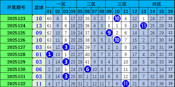 上期蓝球开出大码号码11,近十期蓝球大小比为5:5,大小码球出现次数相同,本期预测大码蓝球热出,重点关注号码:09。