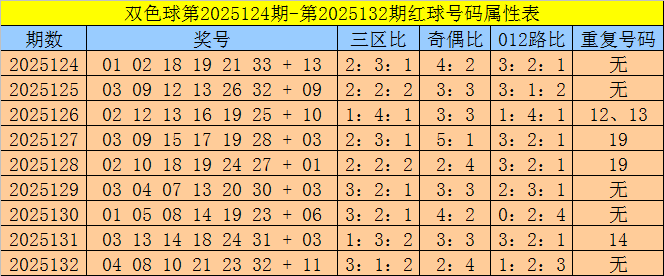 红球三区比:上期红球三区比为3:1:2,红球最近9期三区号码个数比为19:22:13,本期注意红三区号码走冷,预计红二区号码热出,红球三区比关注2:3:1。