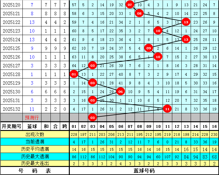2路红球上期开出3个:08、23、32,表现较热,最近50期2路红球出现101个,前10期2路红球开出17个,表现较冷,本期预计2路红球继续温冷,看好开出2个,注意红球:11、20。