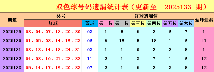 双色球上期开奖号码回顾:红球05 14 17 19 20 33;蓝球07,红球号码大小比为4:2,三区比为1:4:1。蓝球开出小奇数07。
