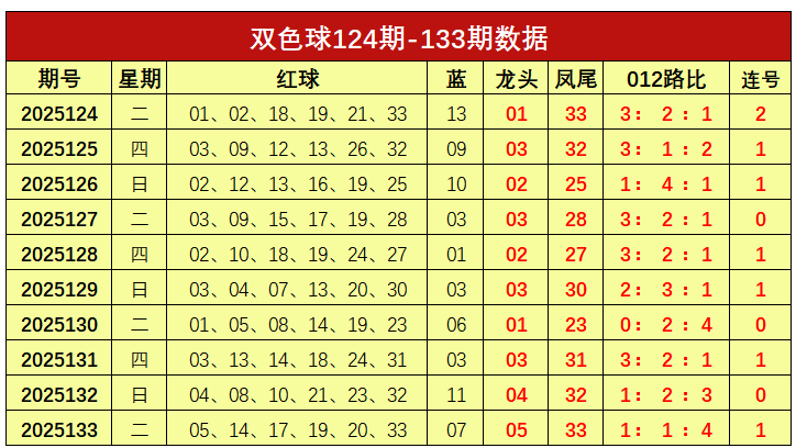 双色球第2025133开奖奖号:红球05、14、17、19、20、33,蓝球07。龙头05,凤尾33,012路比为1:1:4,开出1组连号。