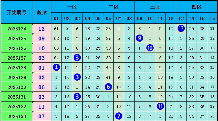 蓝球:前10期蓝球分别为:13 09 10 03 01 03 06 03 11 07,其中奇偶蓝球奇数球胜出,本期看好奇数蓝球,参考蓝球13.