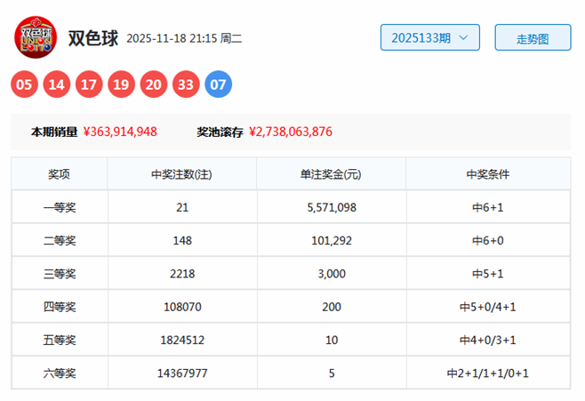 双色球第2025133期开出奖号为05、14、17、19、20、33+07。其中红球号码奇偶比为4:2,三区比为1:4:1,大小比为4:2,蓝球开出奇数号码07。