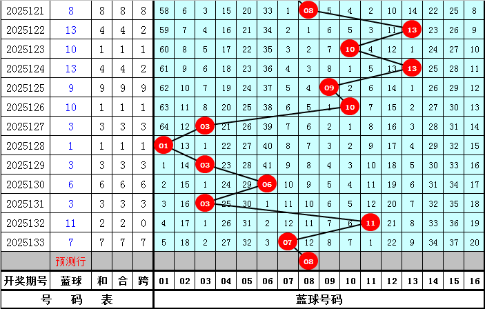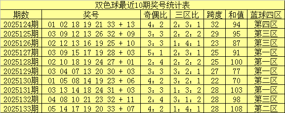 南华天第2025134期双色球区间号码个数统计分析:(红球:01-11为一区,12-22为二区,23-33为三区;蓝球:01-04为一区,05-08为二区,09-12为三区,13-16为四区)