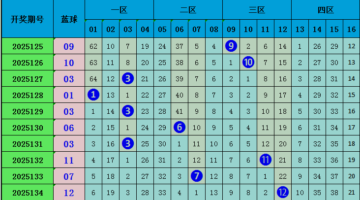 上期蓝球开出号码12,近十期蓝球在一区开4枚,二区开出号码2枚,三区开出4枚,四区开出0枚,区间比4:2:4:0,本期推荐蓝球出现在四区,重点关注14。