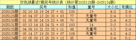 红球重号:上期重号红球出现1个:05,在连续7期开奖中,重号出现3期,在最近3期中奖,重号出现1期,本期预计重号热出,关注1个,参考号码05。
