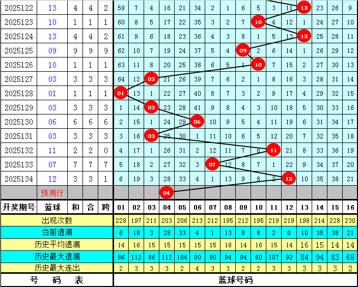 蓝球:上期蓝球号码为12,开出大号、偶数,蓝球最近7期大小比为2:5,本期注意小 号蓝球出现,蓝球关注04。