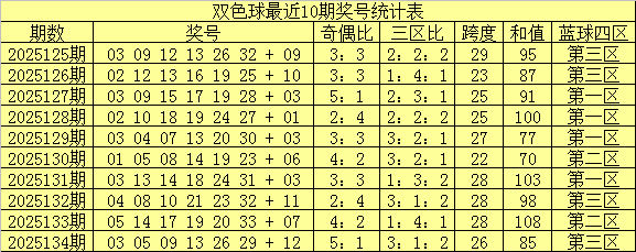 双色球第2025134期开出奖号:03 05 09 13 26 29 + 12。其中红球三区比为3:1:2,和值为85,奇偶比为5:1,跨度为26,蓝球出现在第三区。