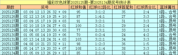 福彩双色球第2025134期红球奖号为:03、05、09、13、26、29,蓝球奖号为:12,其中红球和值为85,012路比为2:1:3,首尾和为32,质合比为4:2,蓝球属性为0路、合号。