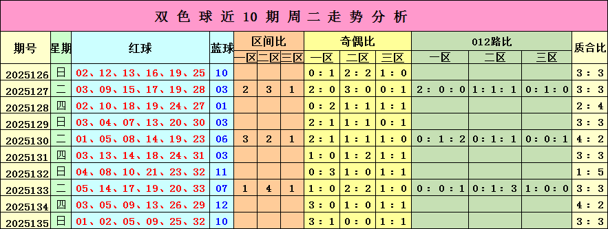 红三区(23-33):上期该区开出2个25、32,上周二该区开出1个33,最近10期该区开出15个奖号,最近10期星期二该区出现3奖号,近10期断区0次,近10期星期二断区0次,本期注意该区落号,排除断档。最近10期该区奇偶比为8:7,其中星期二分别开出奇偶比为0:1、1:0、1:0,奇数号码相对热出。最近10期星期二该区号码012路比为1:1:1,本期该区重点关注2码:29、33。