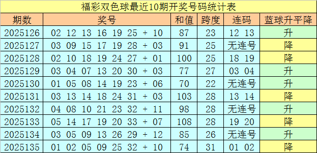 上期开奖:福彩双色球第2025135奖号开出:01 02 05 09 25 32 + 10,红球号码和值为74,首尾间距为31,包含连号:01 02。