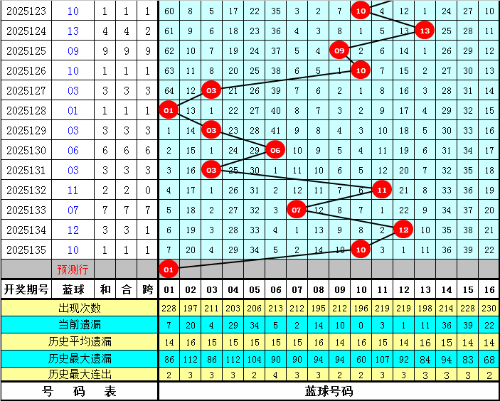 蓝球分析:上期蓝球开出号码10,下降2个点位,最近10期蓝球号码升平降分别为:升、降、降、升、升、降、升、降、升、降,本期看好蓝球下降,独蓝参考01。