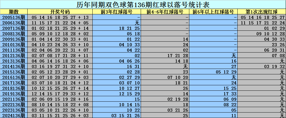 6年前同期奖号分析:从统计表中发现,在历年同期开奖中,双色球第136期奖号,6年前同期号码表现相对较冷,在历史上轮空了2期,今年同期应注意6年前历史同期号码出现,关注号码16 20。