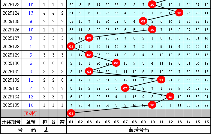 蓝球尾数分析:最近7周星期二开出5个蓝球尾数,重复蓝球尾数明显活跃,本周星期二排除近期已出现的蓝球尾数,注意温冷蓝球尾数回补,关注蓝球01。